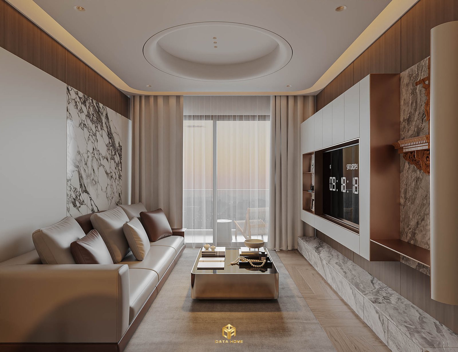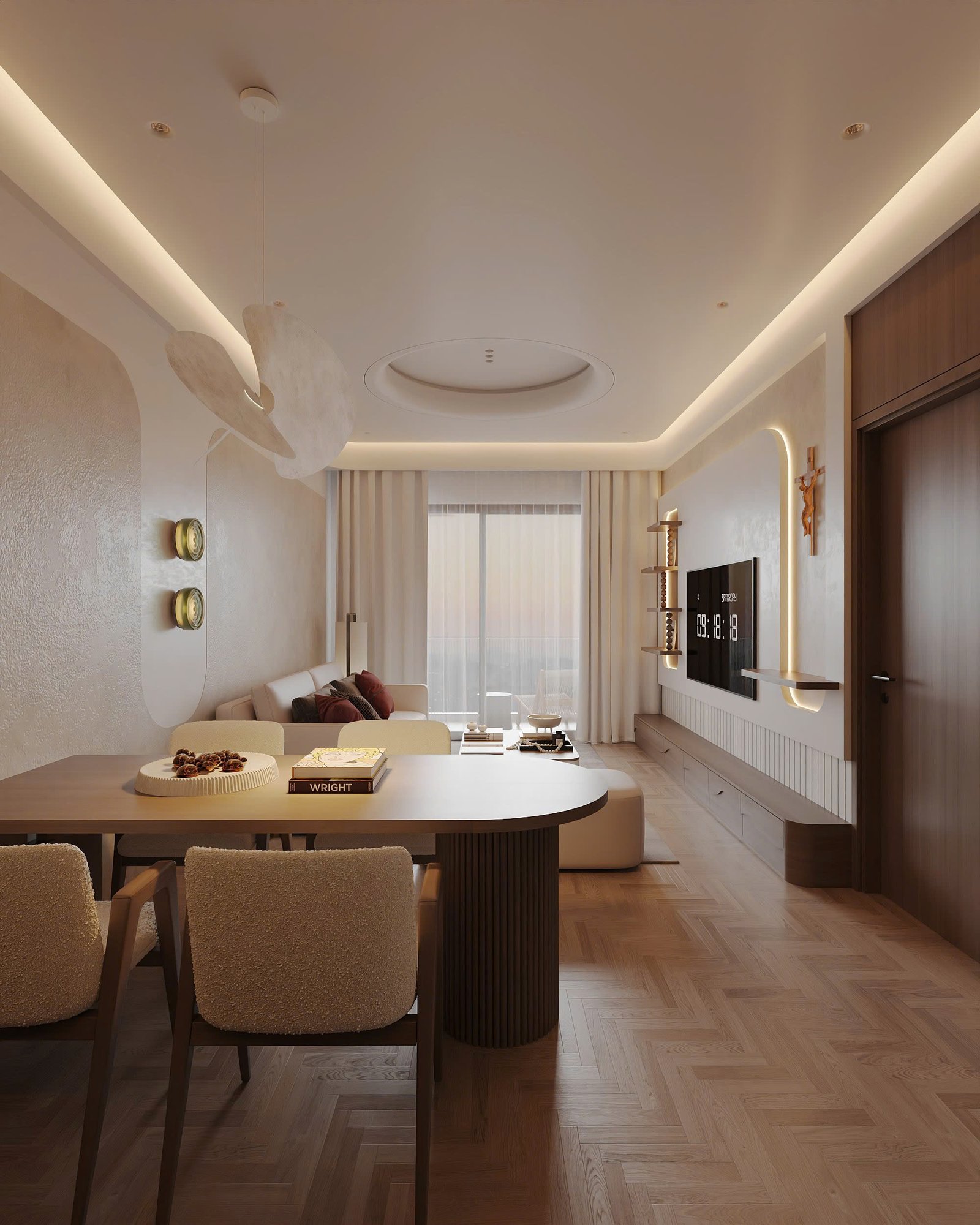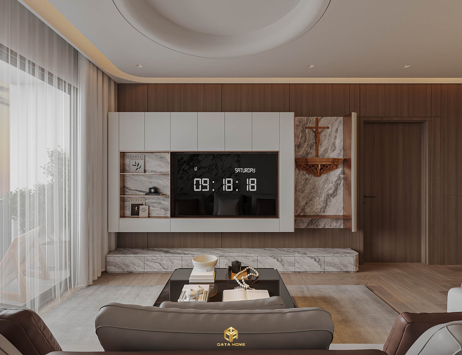 Phòng khách chính là tâm điểm của căn hộ, nơi thiết kế nội thất phong cách hiện đại căn hộ Gamuda được thể hiện rõ nhất. Tường TV được uốn cong mềm mại, viền LED vàng ấm tạo hiệu ứng ánh sáng dịu dàng, kết hợp kệ trang trí nổi và chi tiết crucifix gỗ tự nhiên mang đến điểm nhấn vừa hiện đại vừa gần gũi.