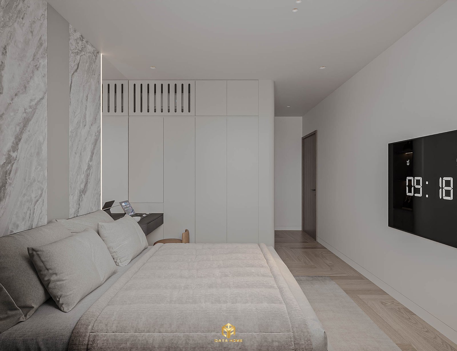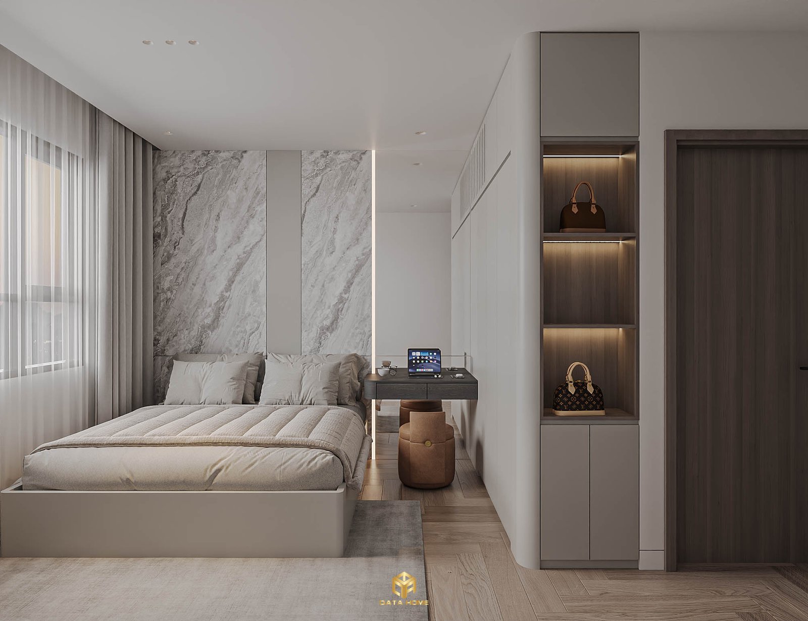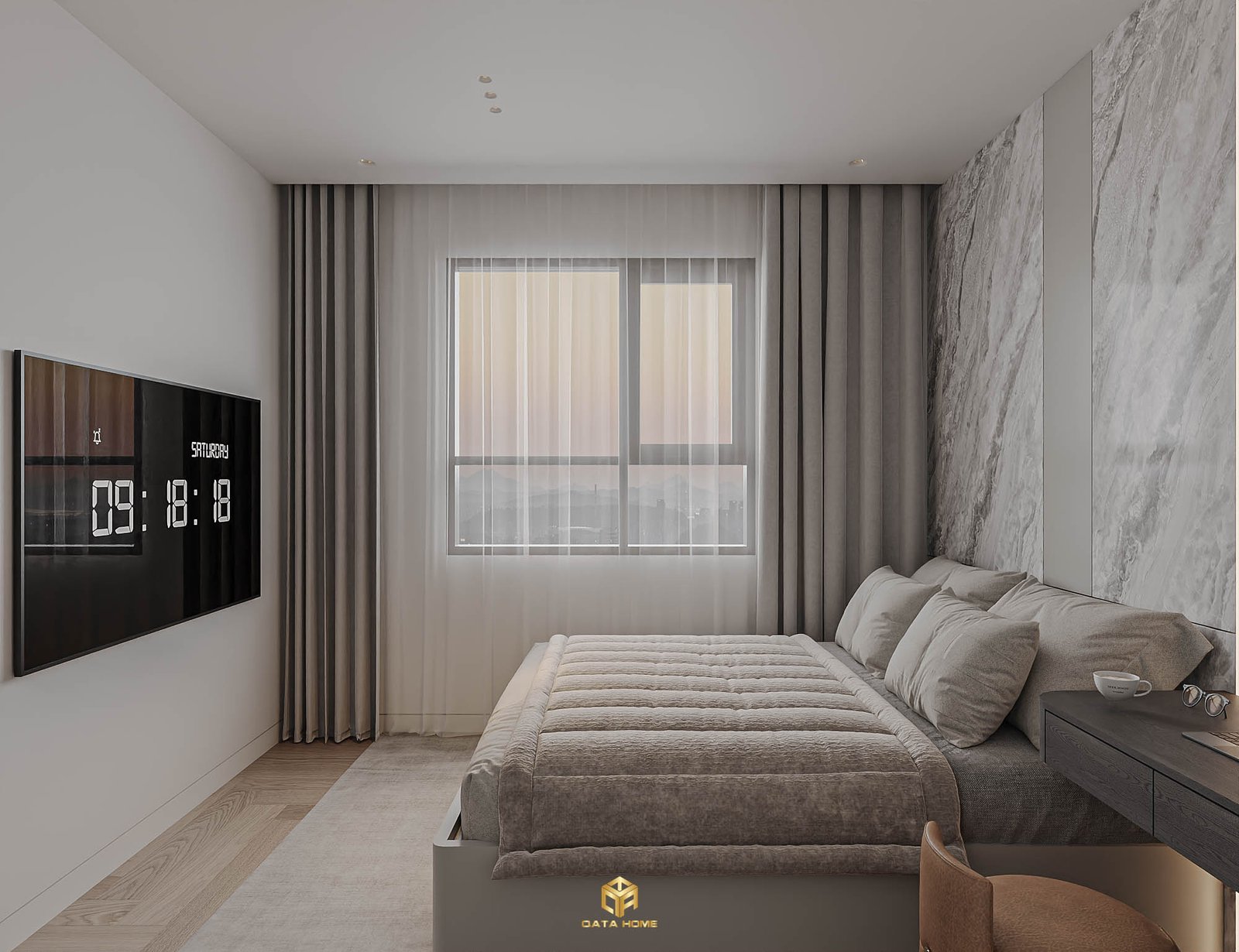 Phòng ngủ chính sử dụng tông xám nhạt và marble trắng làm chủ đạo, mang đến cảm giác sang trọng và thư giãn. Tường đầu giường marble kết hợp TV âm tường, bàn làm việc tối giản và cửa sổ lớn với rèm hai lớp tạo không gian nghỉ ngơi hoàn hảo.
