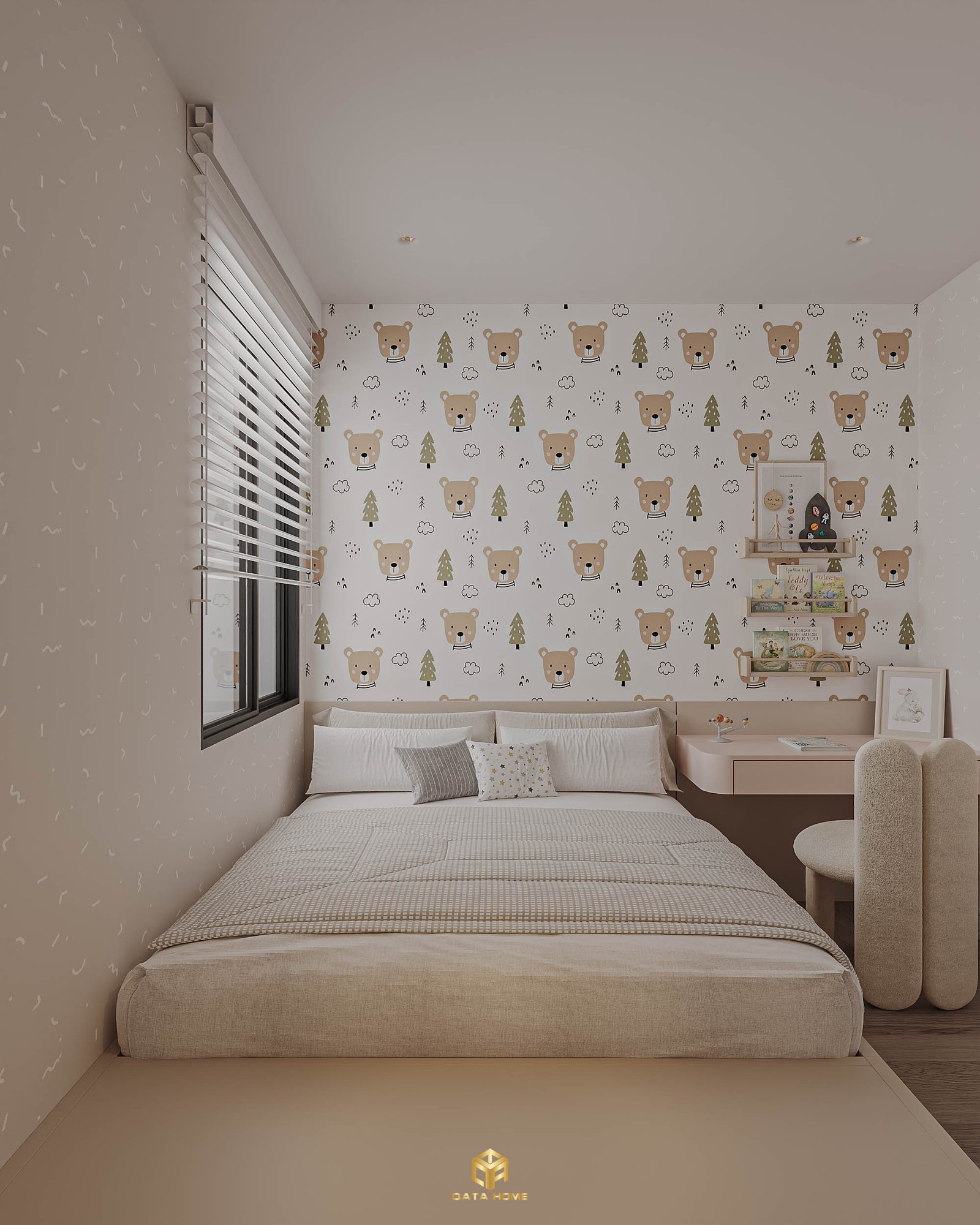 Phòng ngủ trẻ em là một trong những điểm nhấn đáng yêu nhất của dự án. Thiết kế nội thất phong cách hiện đại căn hộ Gamuda tại đây được xây dựng với gam màu pastel nhẹ nhàng, giấy dán tường họa tiết gấu teddy và cây thông dễ thương.