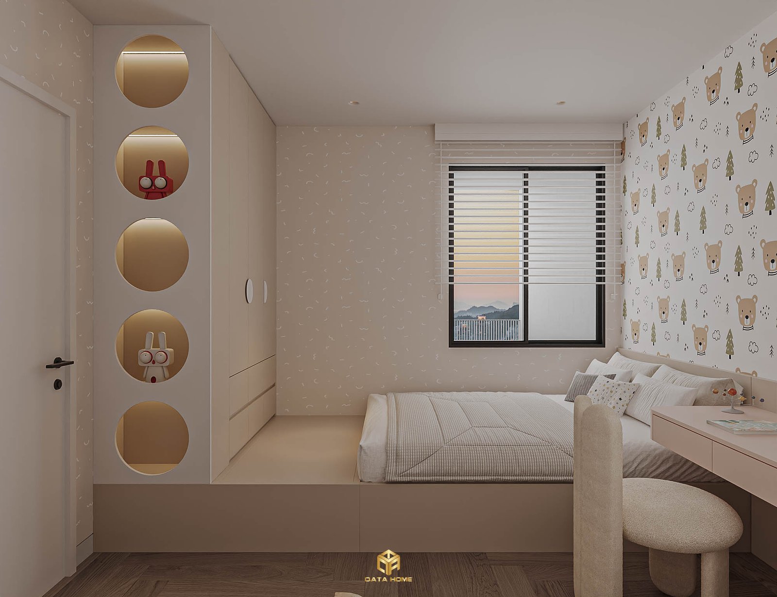 Hệ kệ tròn âm tường chiếu sáng LED tạo cảm giác như những “cửa sổ thần tiên”, vừa là chỗ trang trí vừa là nơi lưu trữ đồ chơi. Giường ngủ platform thấp gần sàn giúp bé dễ dàng tự do vận động, kết hợp bàn học nhỏ gọn và cửa sổ lớn đón ánh bình minh. Toàn bộ không gian vừa an toàn, vừa khơi dậy trí tưởng tượng – đúng tinh thần hiện đại mà Qata Home luôn theo đuổi.