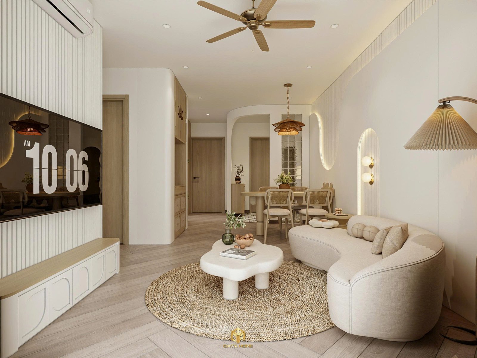 Những đường cong mềm của nội thất giúp căn hộ trở nên dịu dàng và gần gũi hơn, giảm bớt sự cứng nhắc thường thấy trong các không gian hiện đại.