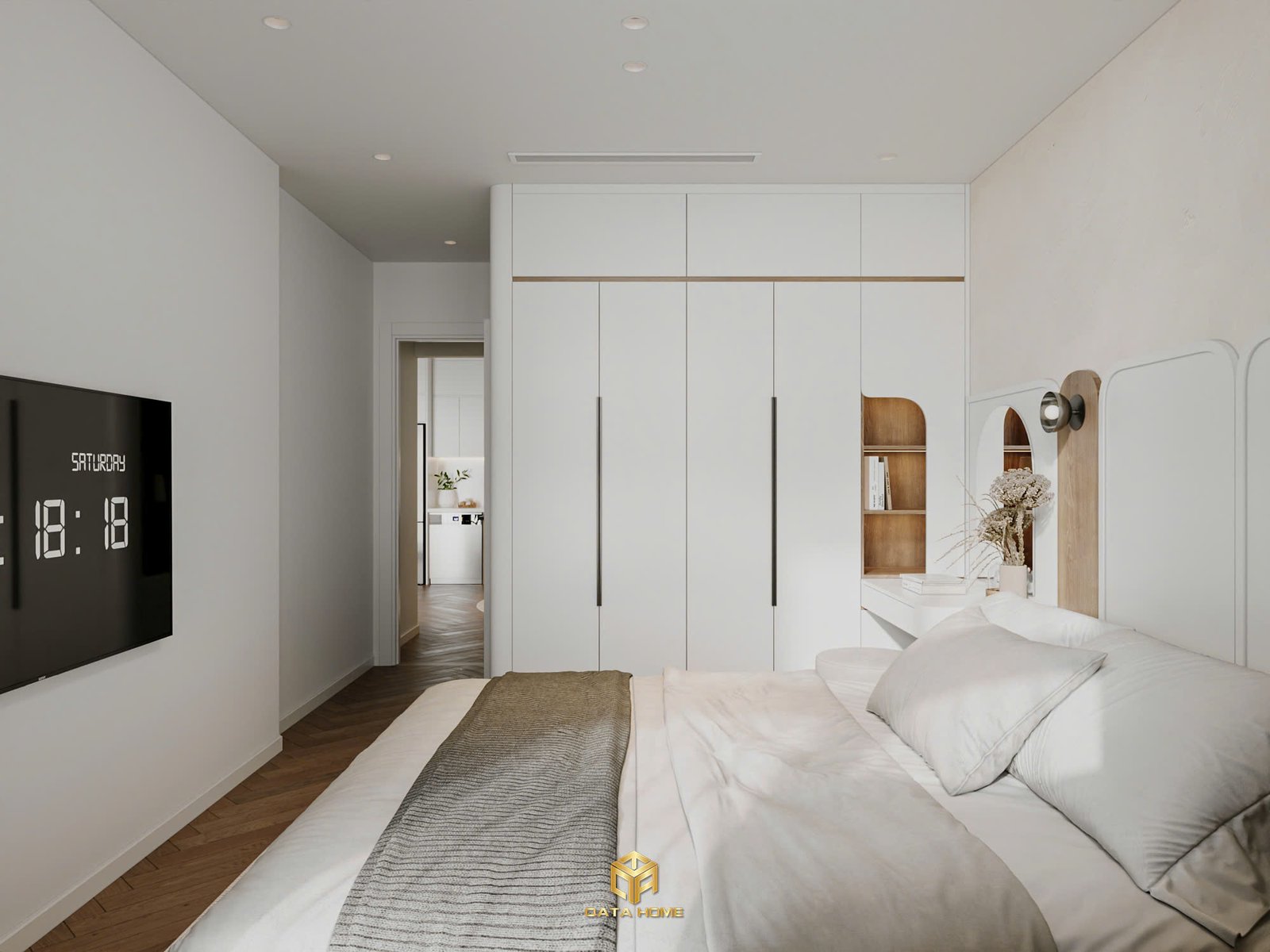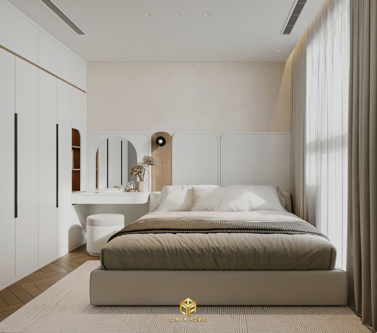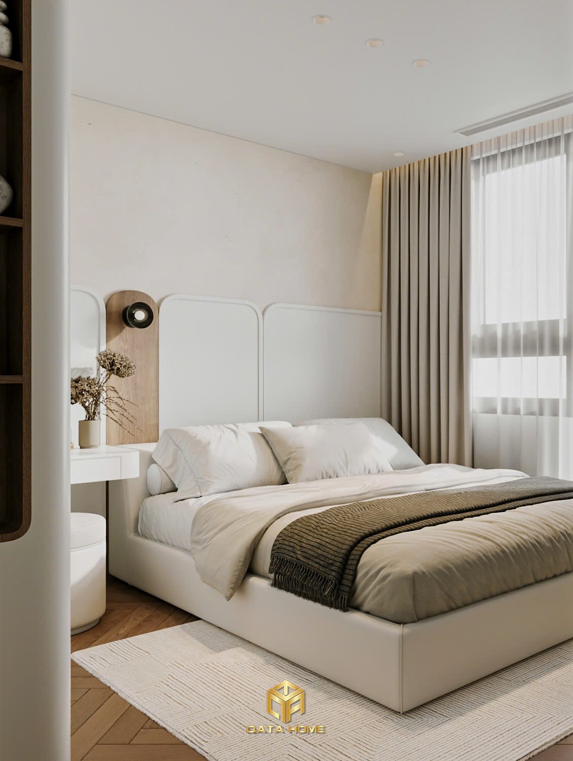 Gam màu chủ đạo vẫn là trắng – be – nâu, nhưng được phối hợp tinh tế để tránh cảm giác đơn điệu. Giường thấp, chăn ga đơn giản, ánh sáng tự nhiên kết hợp rèm mềm mại tạo nên một không gian cực kỳ dễ chịu.