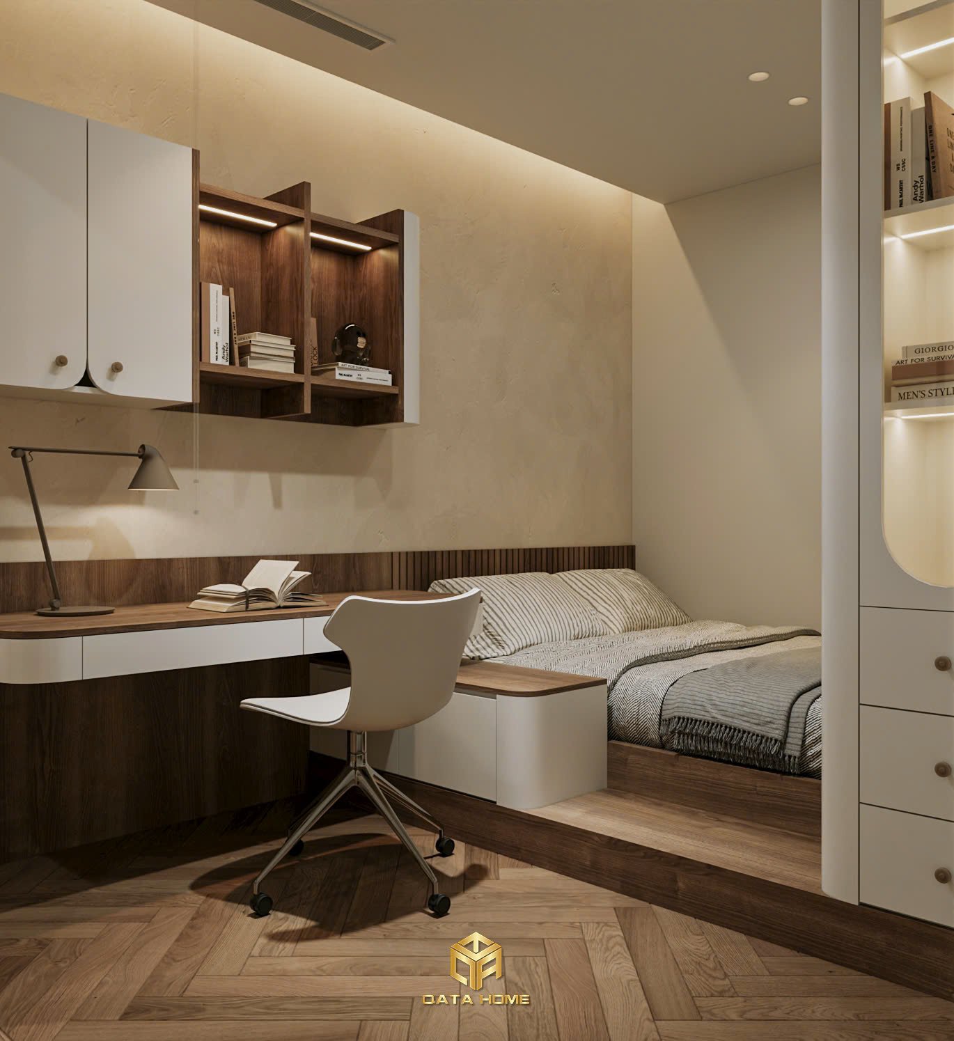 Bàn làm việc liền khối với giường, hệ tủ treo gọn gàng, ánh sáng được bố trí vừa đủ – tất cả tạo nên một không gian đa năng nhưng vẫn giữ được sự tinh tế.