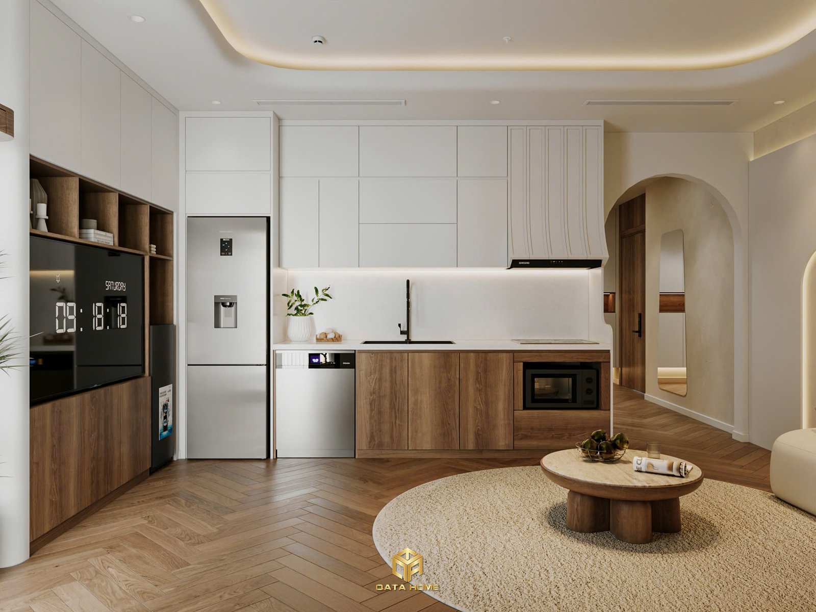 Hệ tủ bếp trắng kết hợp gỗ tự nhiên tạo nên sự cân bằng hoàn hảo giữa hiện đại và ấm áp. Không có chi tiết thừa, không có màu sắc nổi bật, tất cả đều hướng đến sự tối giản tuyệt đối.