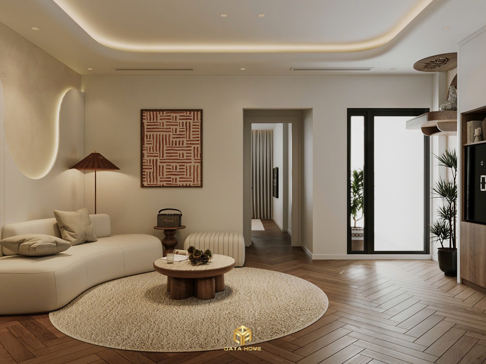 Phòng khách là nơi thể hiện rõ nhất tinh thần của thiết kế nội thất Wabi Sabi chung cư BRG. Bộ sofa bo cong với tone kem nhẹ nhàng như tan vào không gian, kết hợp cùng bàn trà gỗ thấp tạo cảm giác gần gũi, thân thiện.