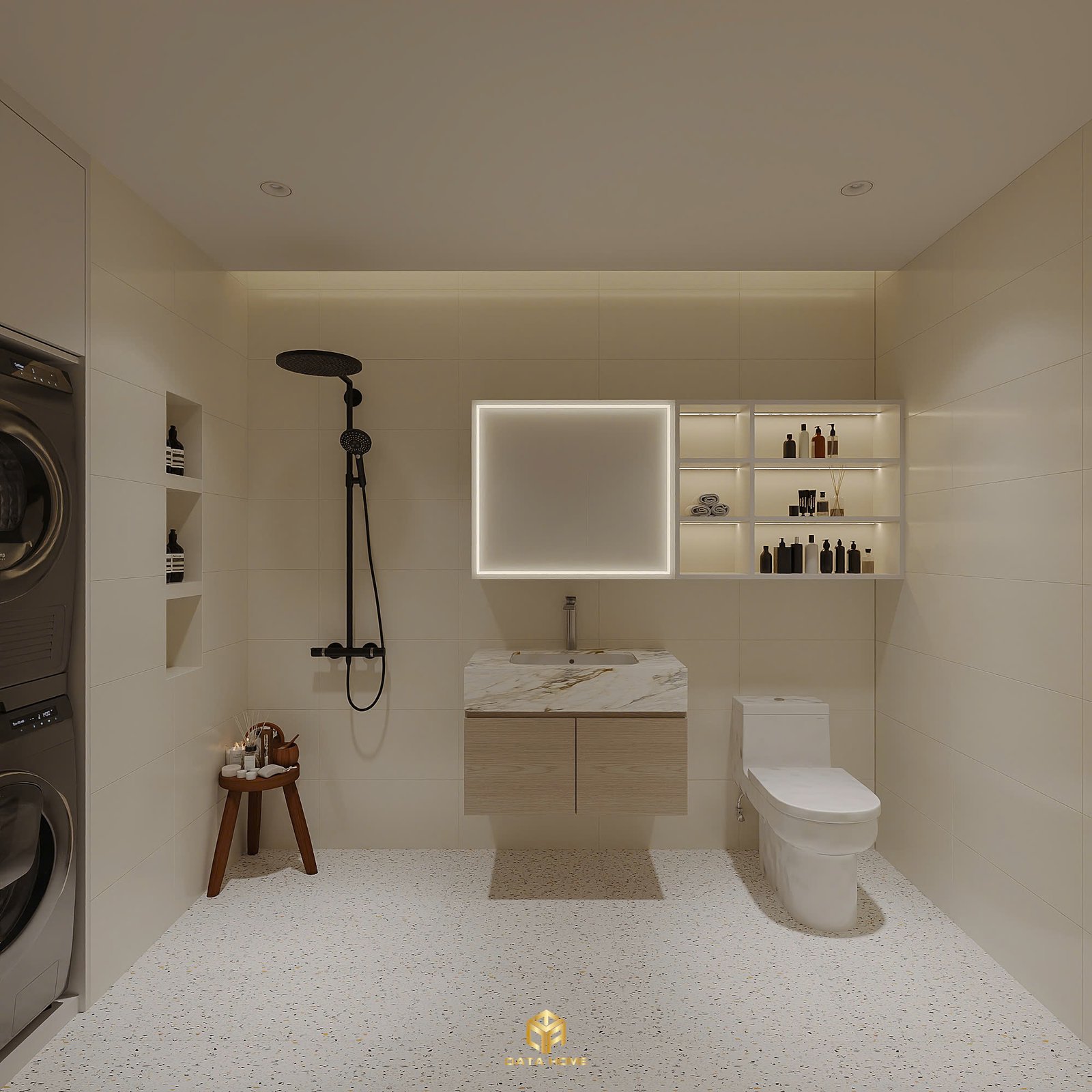 Các chi tiết được tinh giản tối đa nhưng vẫn đảm bảo đầy đủ tiện nghi, mang lại trải nghiệm thư giãn sau một ngày dài.Phòng tắm trong thiết kế nội thất Wabi Sabi hiện đại chung cư HPC với bề mặt đá tự nhiên và ánh sáng nhẹ nhàng.