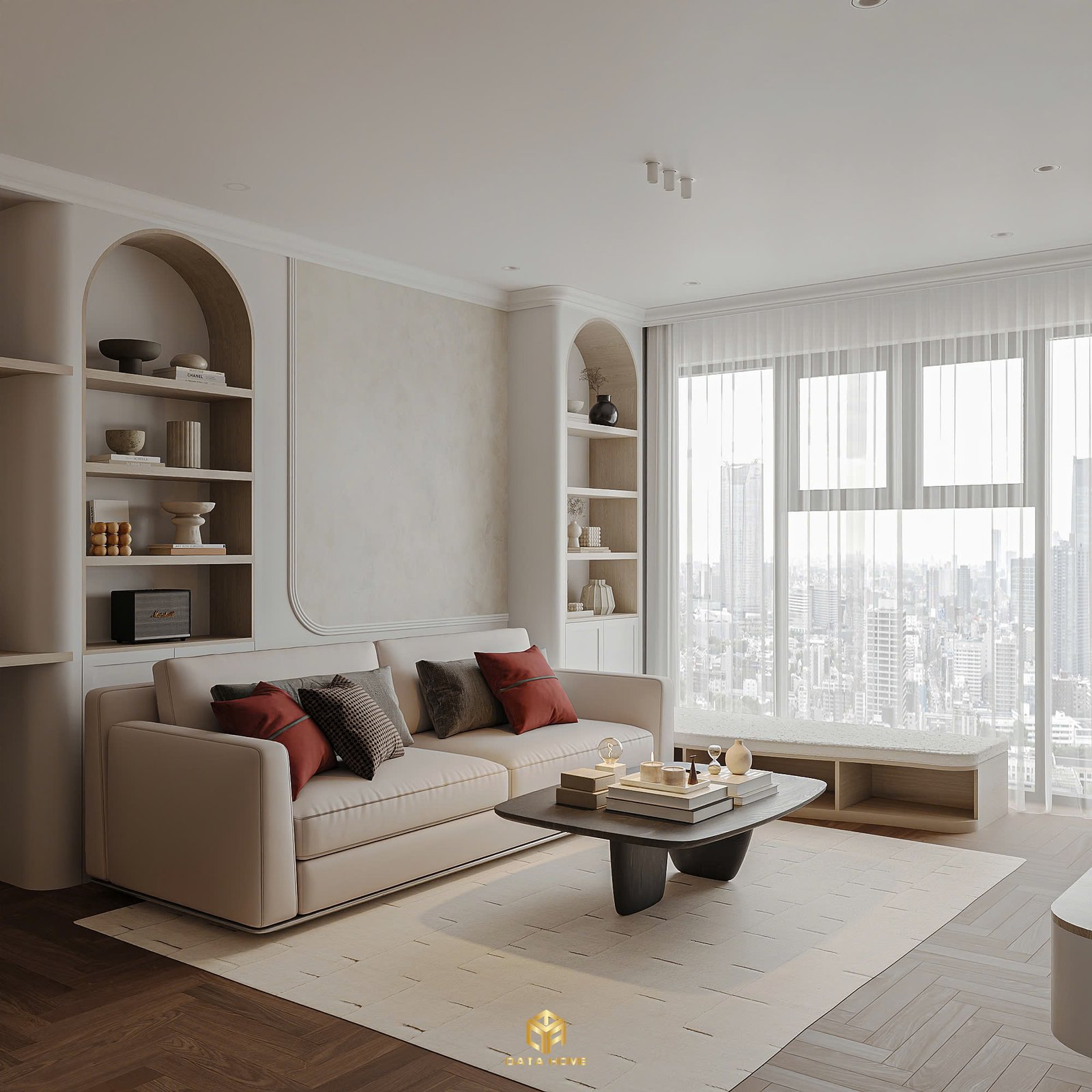 Phòng khách trong thiết kế nội thất Wabi Sabi hiện đại chung cư HPC