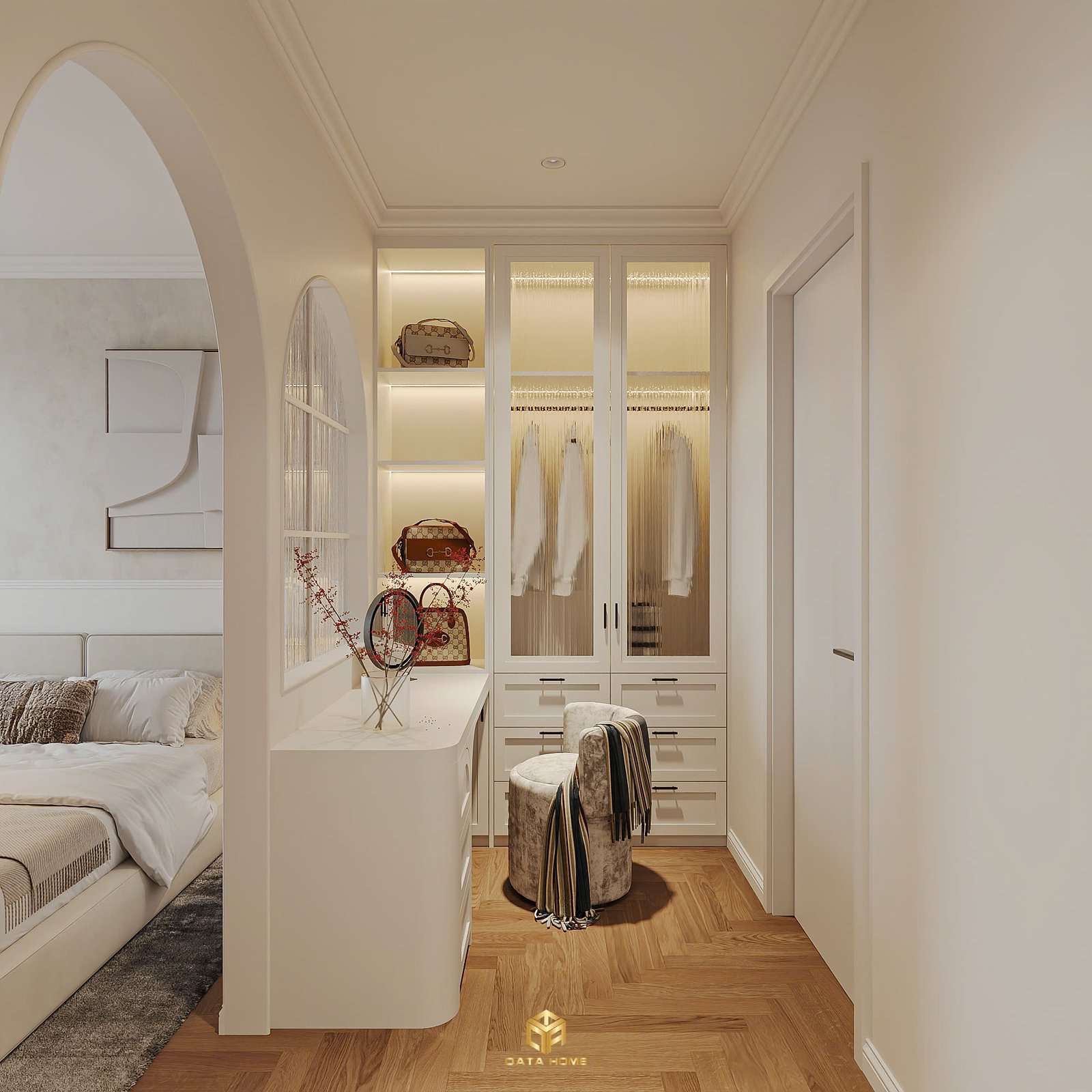 Khu vực tủ đồ và thay đồ được thiết kế tinh tế, tối ưu lưu trữ với ánh sáng ấm áp và phong cách thanh lịch.