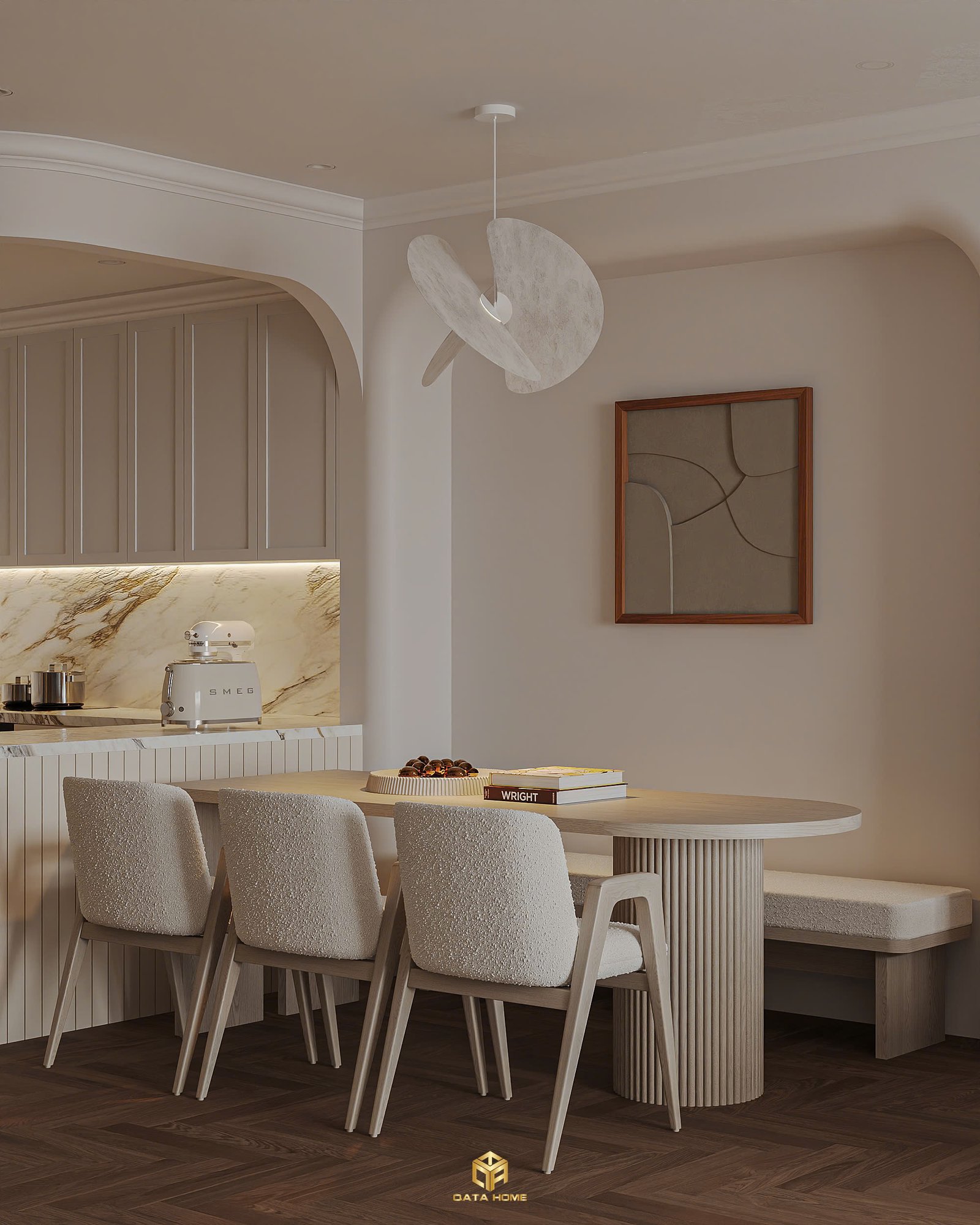 Khu bếp trong thiết kế nội thất Wabi Sabi hiện đại chung cư HPC với tủ bếp gỗ mộc, bàn ăn tối giản và ánh sáng vàng ấm áp