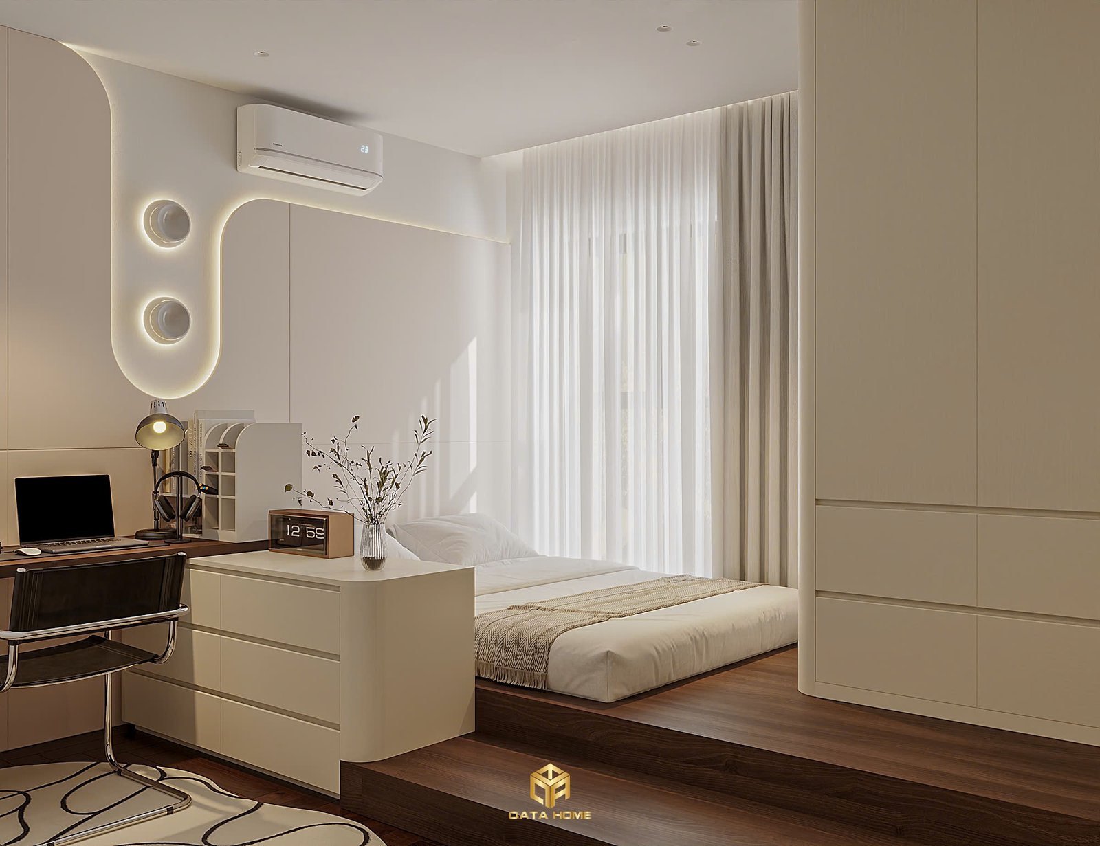 Ánh sáng tự nhiên được tận dụng tối đa qua rèm mỏng, kết hợp ánh sáng gián tiếp tạo nên cảm giác dịu nhẹ. Một vài chi tiết như đèn ngủ gốm, bàn nhỏ gỗ thô giúp không gian thêm phần ấm áp.