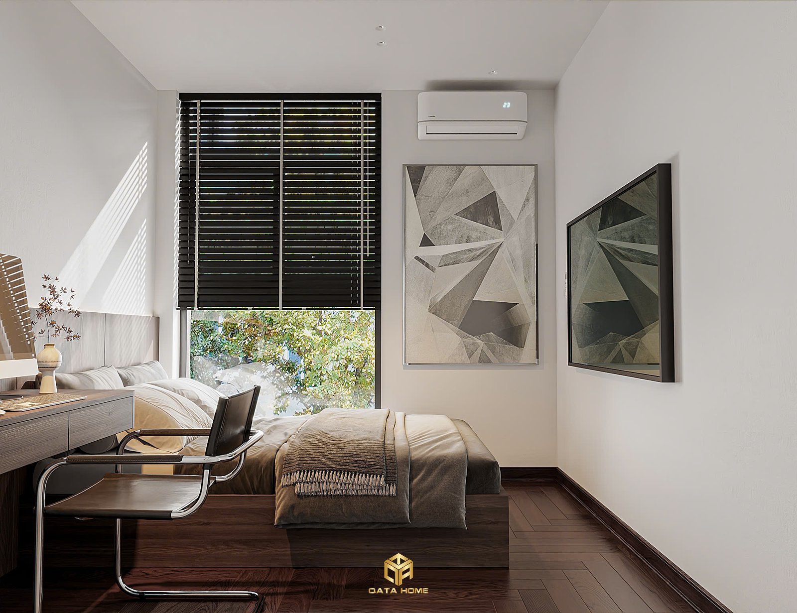 Phòng ngủ mang đậm tinh thần tối giản với giường thấp, chăn ga màu trung tính và nội thất hạn chế tối đa. Không gian được “giải phóng” khỏi những chi tiết thừa, giúp tâm trí trở nên thư thái hơn.