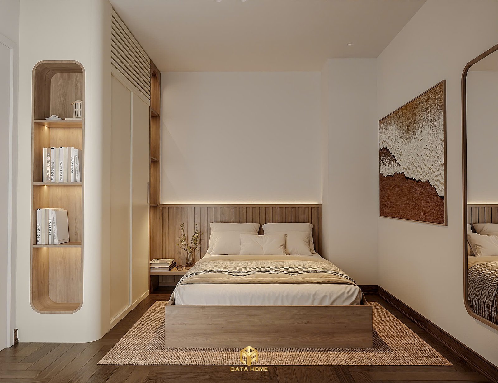Mô tả ảnh: Phòng ngủ thiết kế nội thất Wabi Sabi hiện đại chung cư HPC với giường thấp, tông màu trung tính và ánh sáng dịu nhẹ.