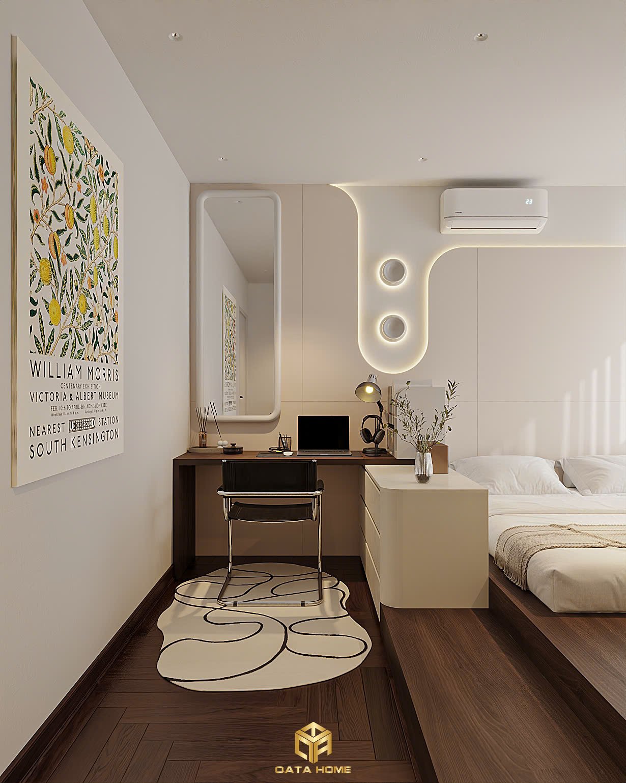 Góc bàn làm việc gọn gàng được bố trí tinh tế trong phòng ngủ, tối ưu không gian và tăng tính tiện nghi.