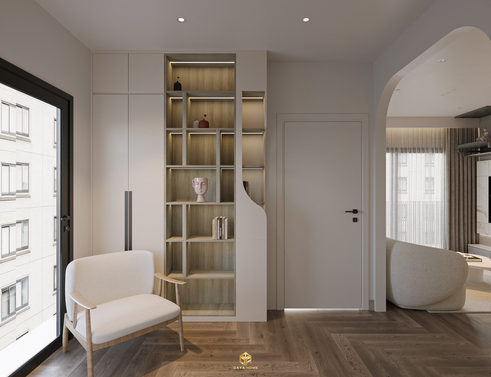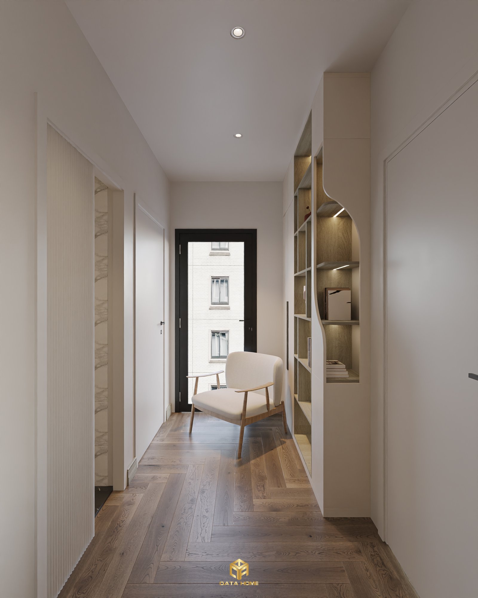 Hành lang được thiết kế như một lối đi thiền định, với sàn gỗ herringbone ấm áp, tường sơn màu be nhạt và kệ sách cong hình cung tích hợp ghế ngồi đơn giản. Chi tiết vách ngăn cong mềm mại dẫn dắt ánh mắt từ phòng này sang phòng khác, tạo cảm giác chuyển động liên tục nhưng vẫn yên bình. Ghế accent gỗ tự nhiên đặt cạnh kệ sách chứa đầy sách và đồ trang trí thủ công, nhấn mạnh giá trị của sự không hoàn hảo và thời gian.