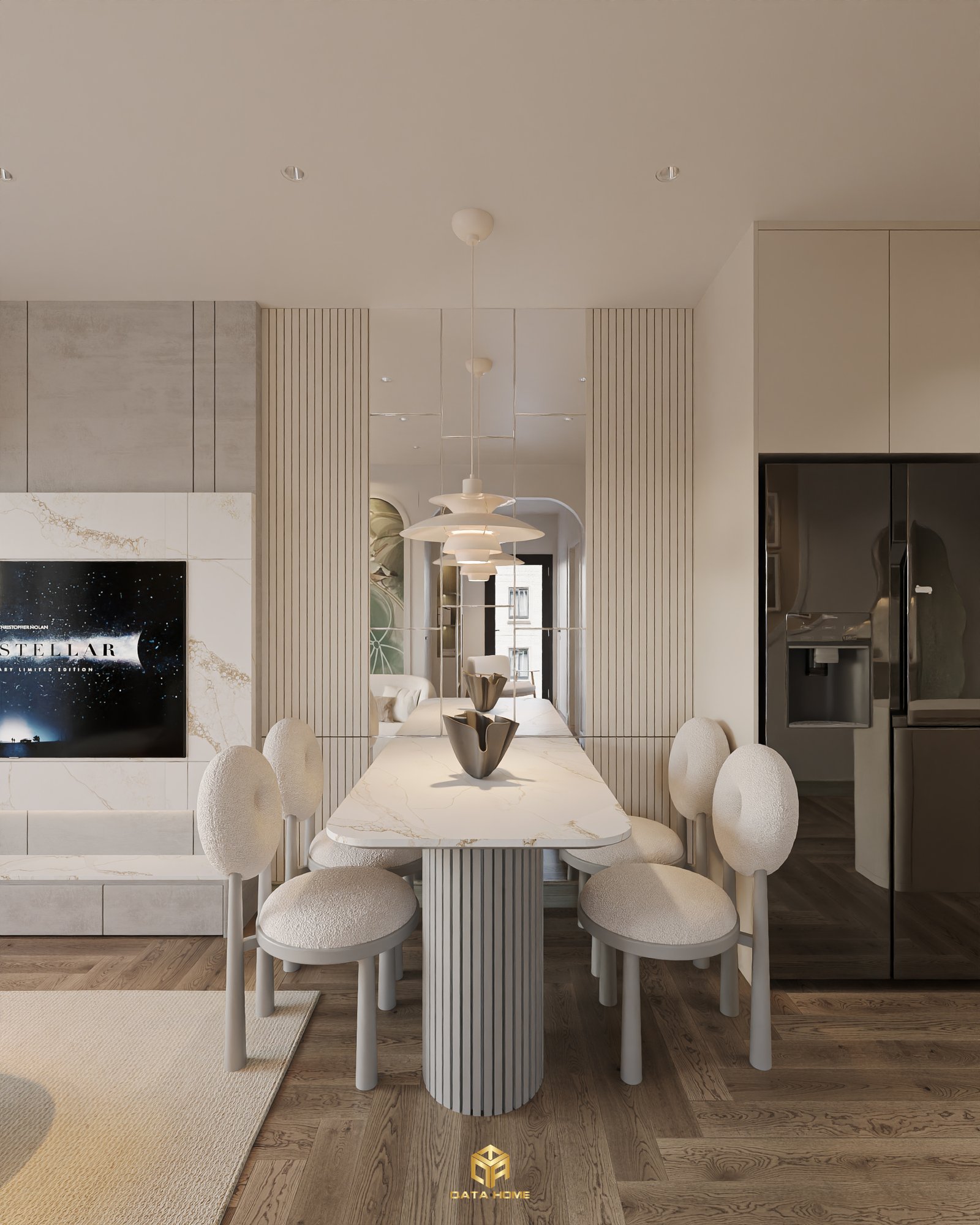 Bàn đá sáng, ghế bọc vải trung tính cùng ánh sáng thả trần tạo nên không gian ấm áp, cân bằng và đầy tính thư giãn