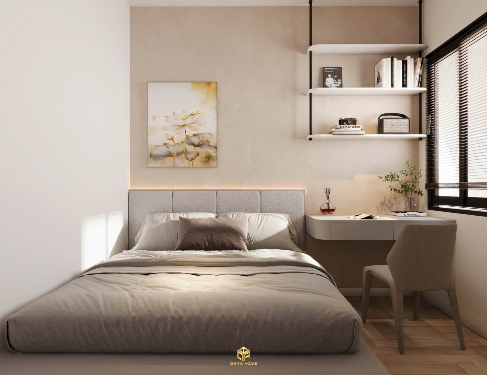 Phòng ngủ master mang đến cảm giác như một góc riêng tư tĩnh lặng. Giường đầu giường bọc vải boucle xám be, kết hợp bàn làm việc gắn tường với kệ treo đen thanh mảnh chứa sách và đồ trang trí như bình hoa khô, máy ảnh cổ. Ánh sáng gián tiếp từ đèn LED dưới kệ và đầu giường tạo không gian ấm áp, giúp dễ dàng chìm vào giấc ngủ sâu. Tranh tường hoa sen vàng nhạt phía đầu giường tiếp tục chủ đề thiên nhiên, mang lại sự thư giãn tối đa.