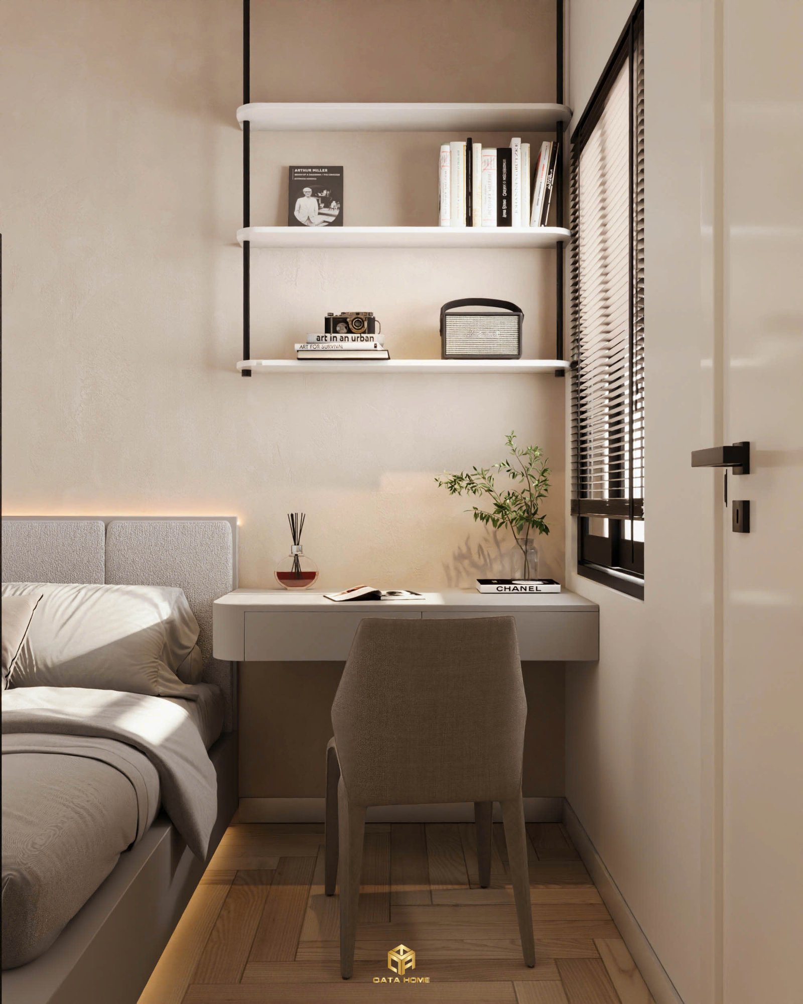 Góc làm việc nhỏ gọn được tích hợp liền kề giường ngủ, sử dụng bàn treo tối giản và ghế bọc vải trung tính mang tinh thần wabi-sabi hiện đại.