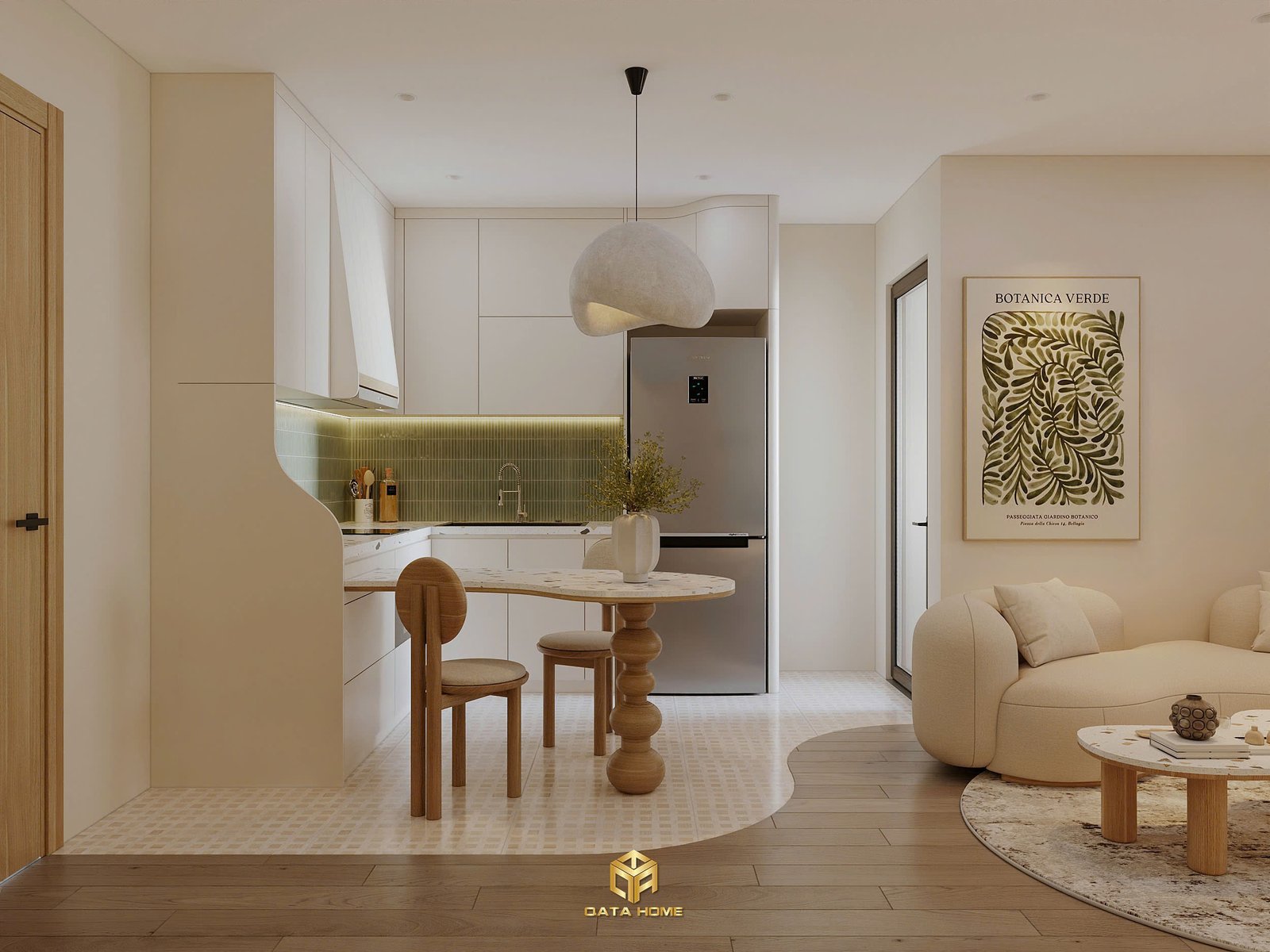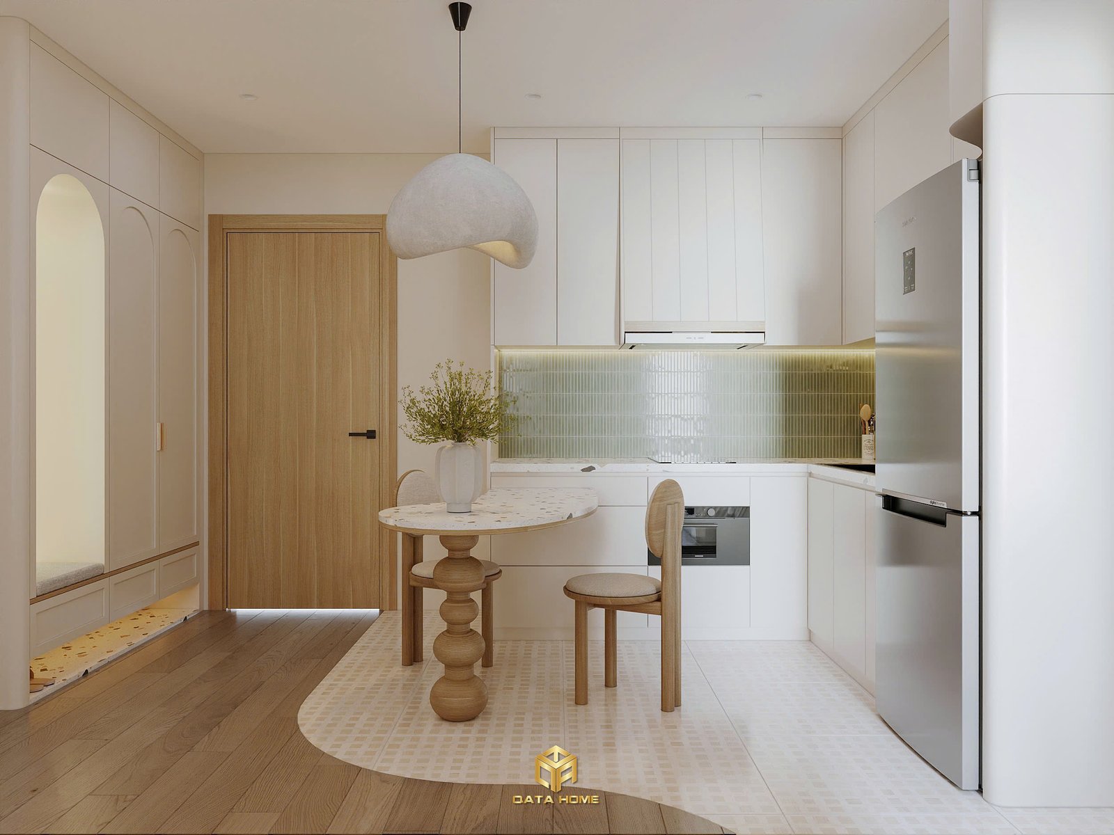 Phần bếp của thiết kế nội thất Wabi Sabi Vinhomes Smart City được tách biệt nhẹ nhàng bằng vách cong bo tròn – một trong những điểm nhấn yêu thích của Qata Home. Backsplash gạch kính xanh lá dưới ánh đèn LED ẩn tạo cảm giác như đang đứng giữa khu vườn mini.