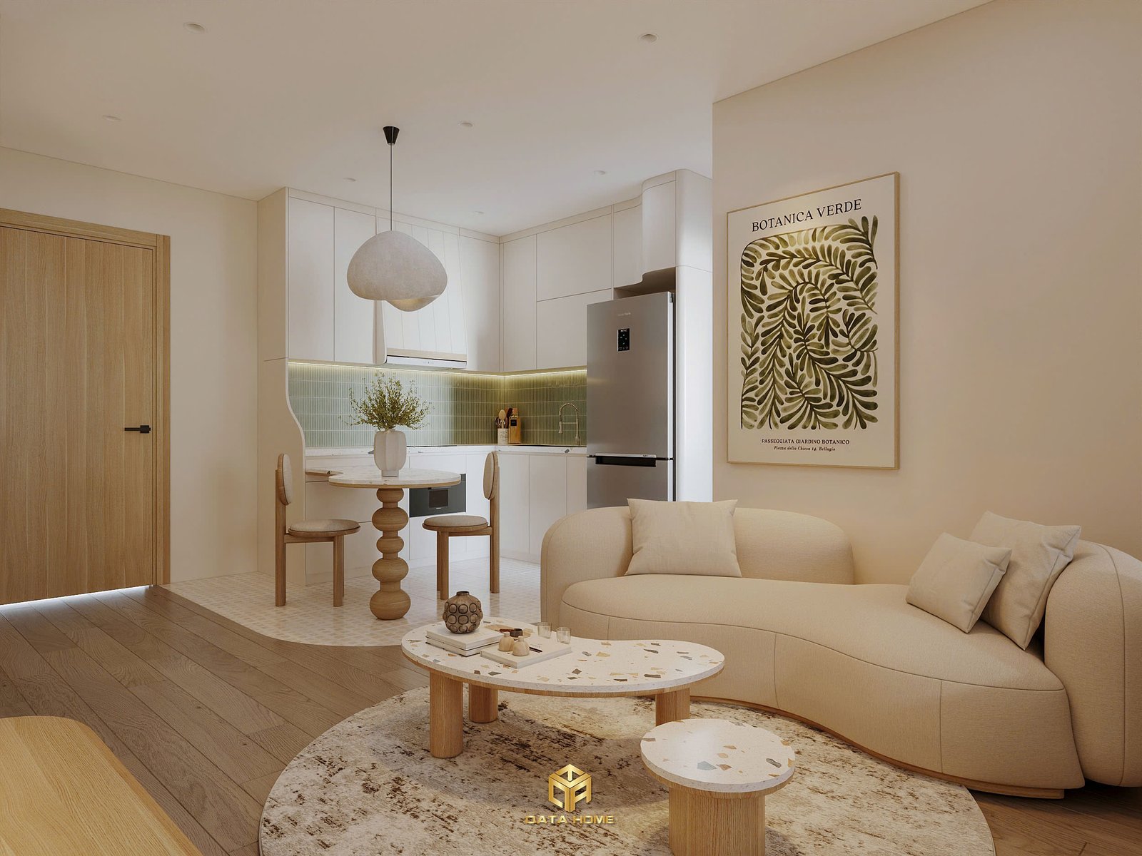 Bàn trà terrazzo với chân gỗ thô mộc đặt trên tấm thảm lông cừu lớn tạo cảm giác vừa gần gũi vừa sang trọng. Chiếc đèn pendant hình đám mây treo lơ lửng như một tác phẩm nghệ thuật, lan tỏa ánh sáng ấm áp. Trên tường là bức tranh “Botanica Verde” với họa tiết lá cây xanh – một lời nhắc nhở tinh tế về sự mong manh của thiên nhiên.