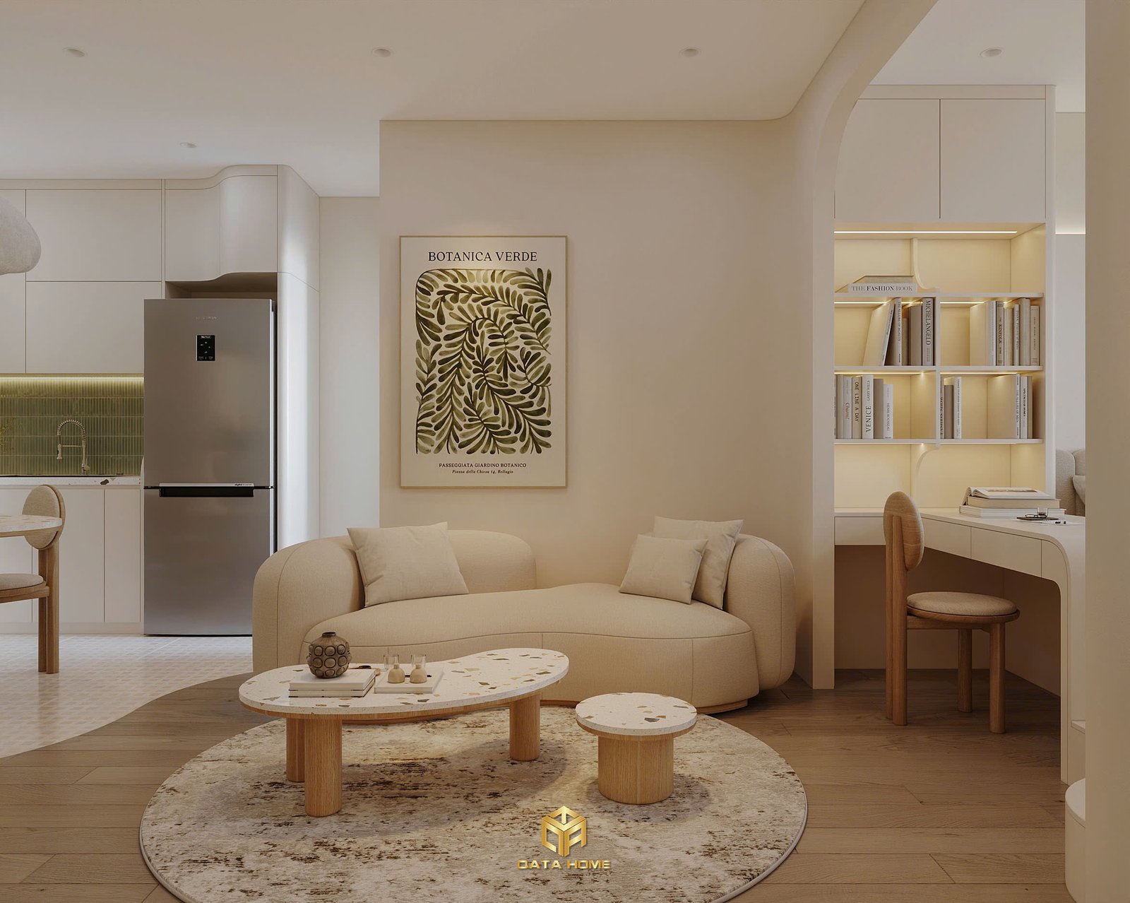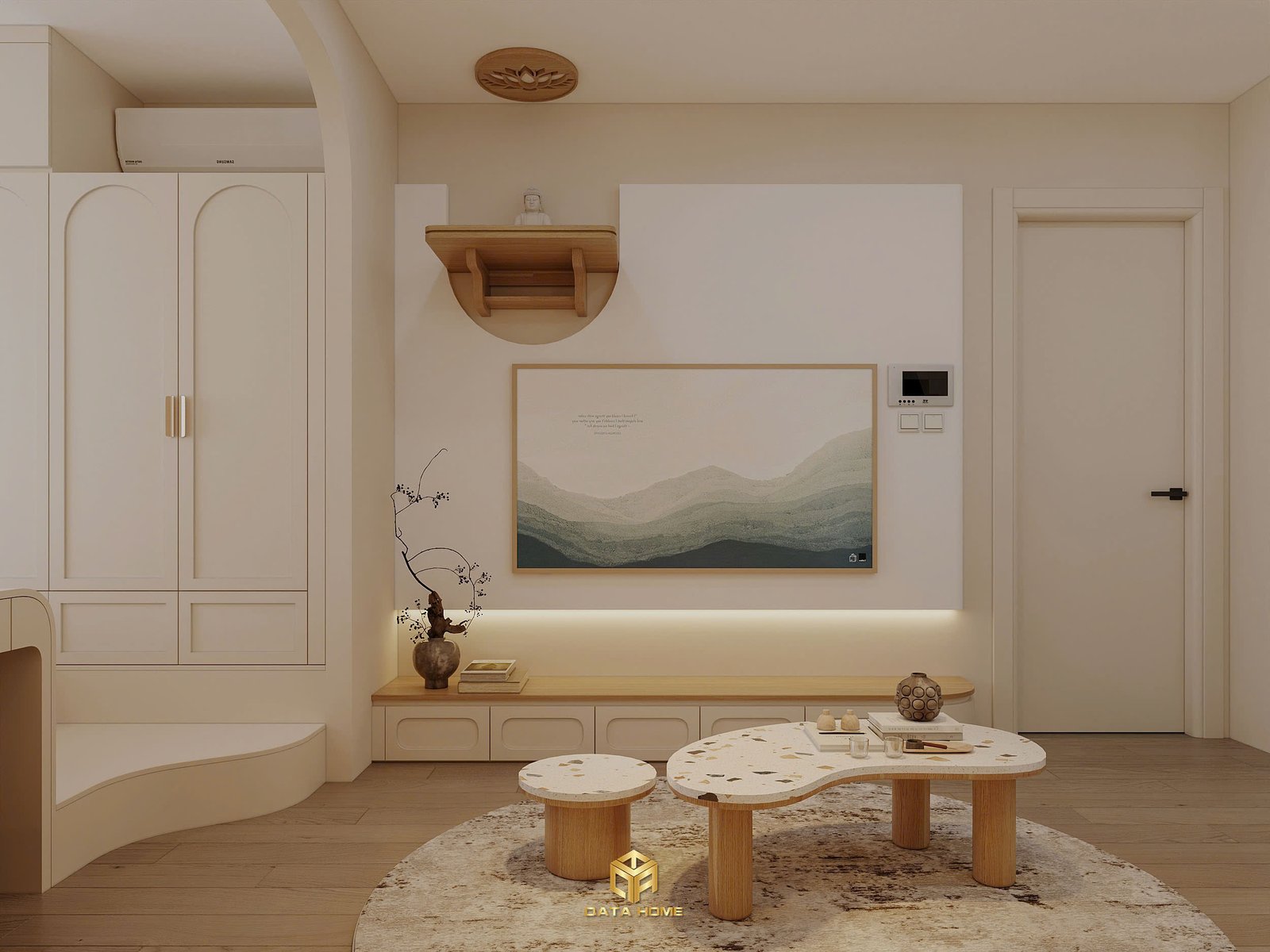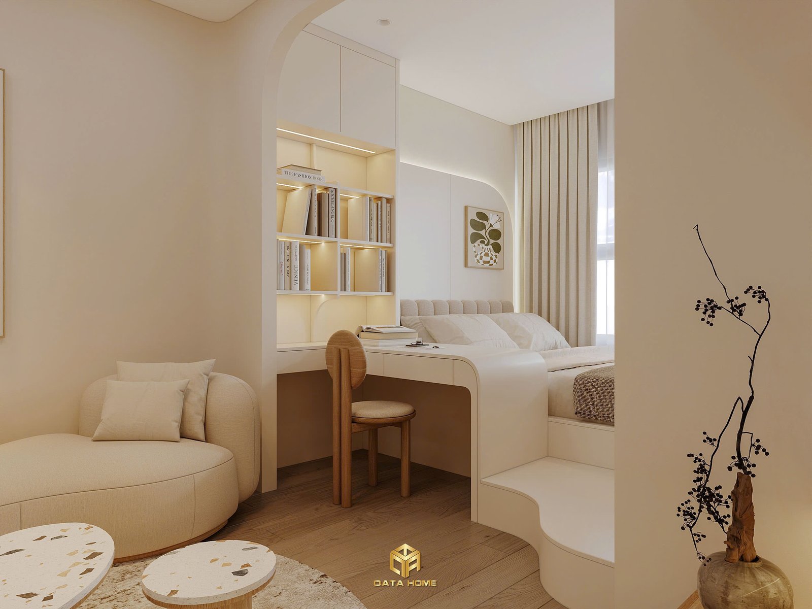 Căn studio trở nên rộng hơn nhờ cách bố trí mở, các vòm cong thay vì góc vuông cứng nhắc, và bảng màu trung tính (be, kem, nâu gỗ nhạt) giúp tâm hồn thư thái ngay khi bước vào. Đây không chỉ là nhà – đây là nơi bạn học cách chấp nhận và trân trọng hiện tại.