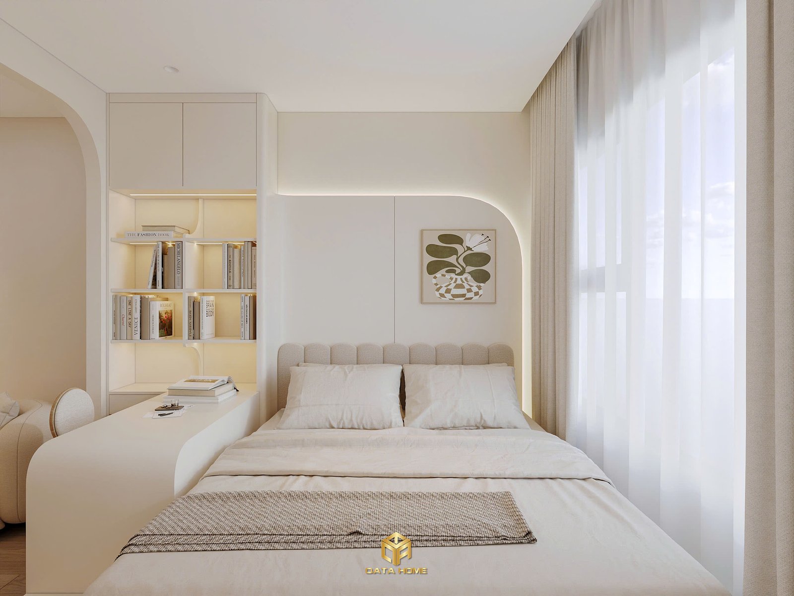 Phòng ngủ được nâng nhẹ tạo thành giường ngủ tích hợp, kết hợp bàn làm việc và kệ sách chiếu sáng ấm áp. Những vòm cong lặp lại xuyên suốt căn hộ tạo nhịp điệu thống nhất. Tủ quần áo lớn với cửa cong bo tròn không chỉ tiện dụng mà còn mềm mại về thị giác.