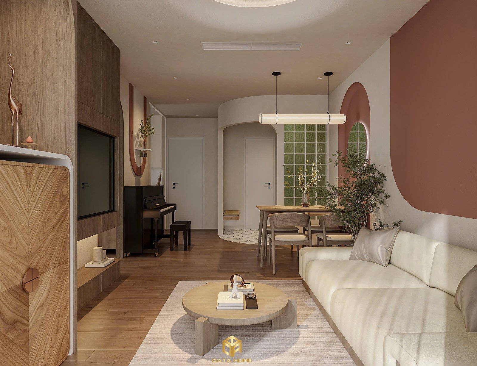 Phòng khách với thiết kế nội thất wabisabi sử dụng tông màu đất ấm, kết hợp nội thất bo cong tạo nên cảm giác nhẹ nhàng và gần gũi.