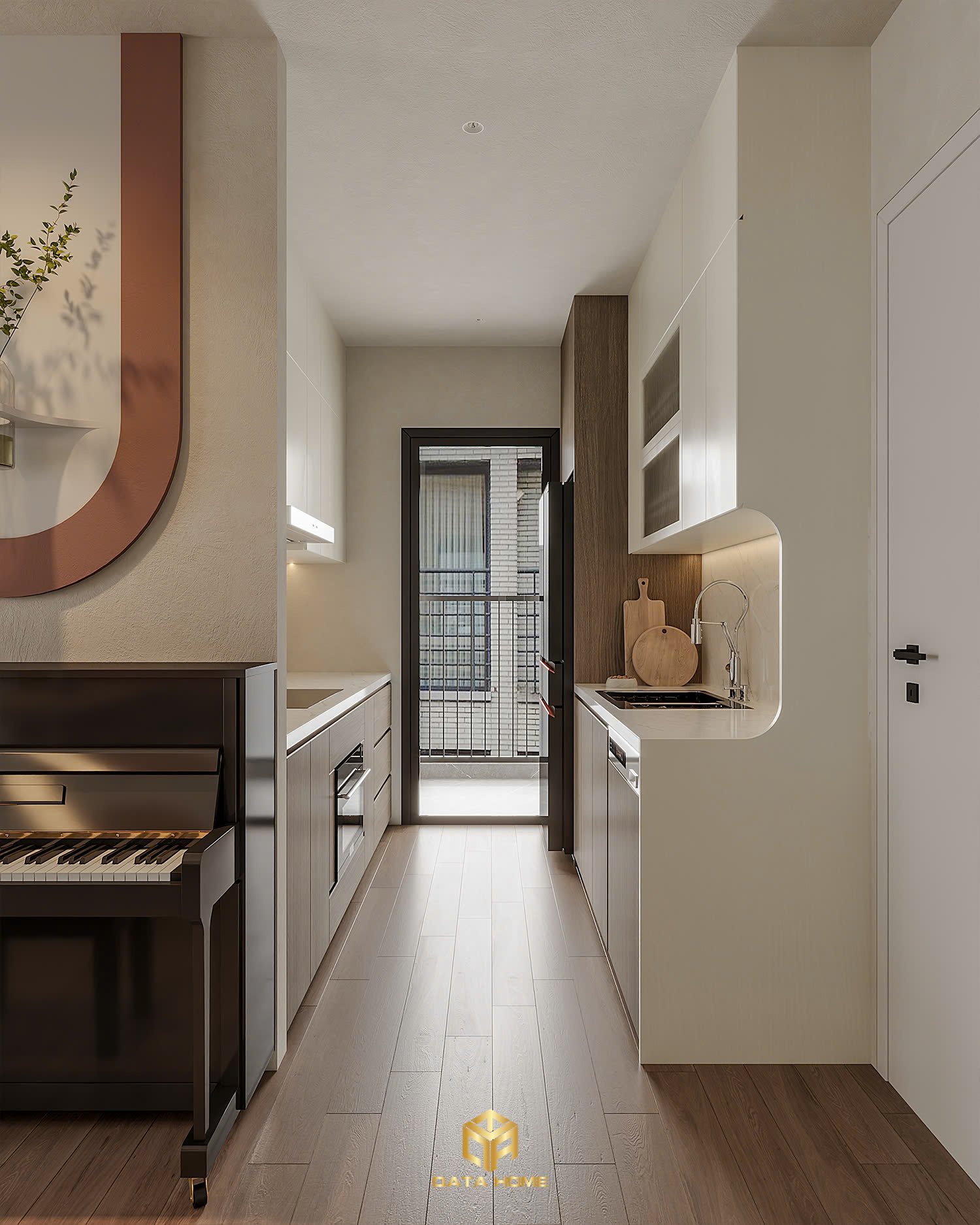 Không gian bếp thể hiện rõ thiết kế nội thất wabisabi qua sự tối giản trong hình khối và vật liệu tự nhiên.