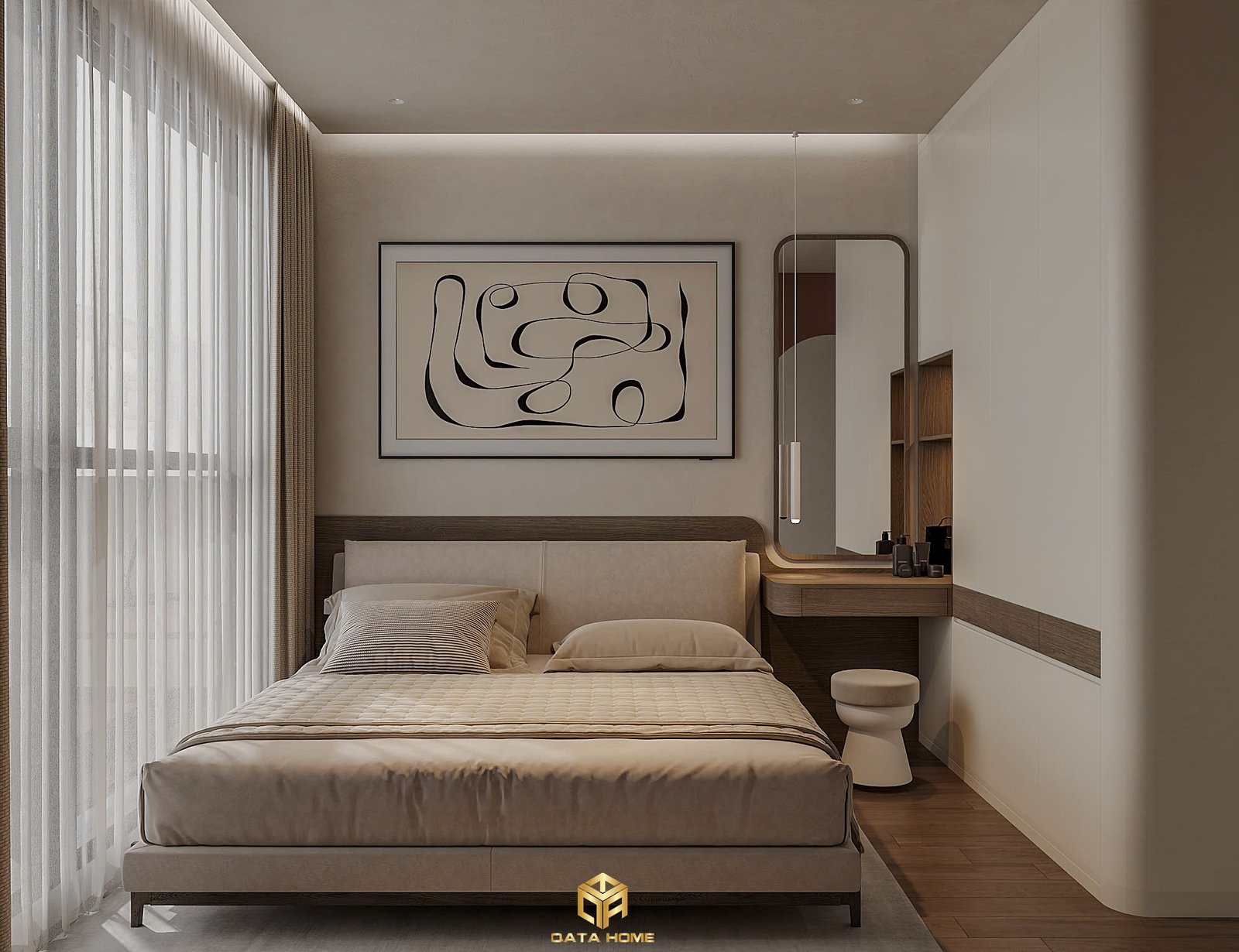 Không gian phòng ngủ theo thiết kế nội thất wabisabi tạo cảm giác an yên với ánh sáng tự nhiên và chất liệu mềm mại.